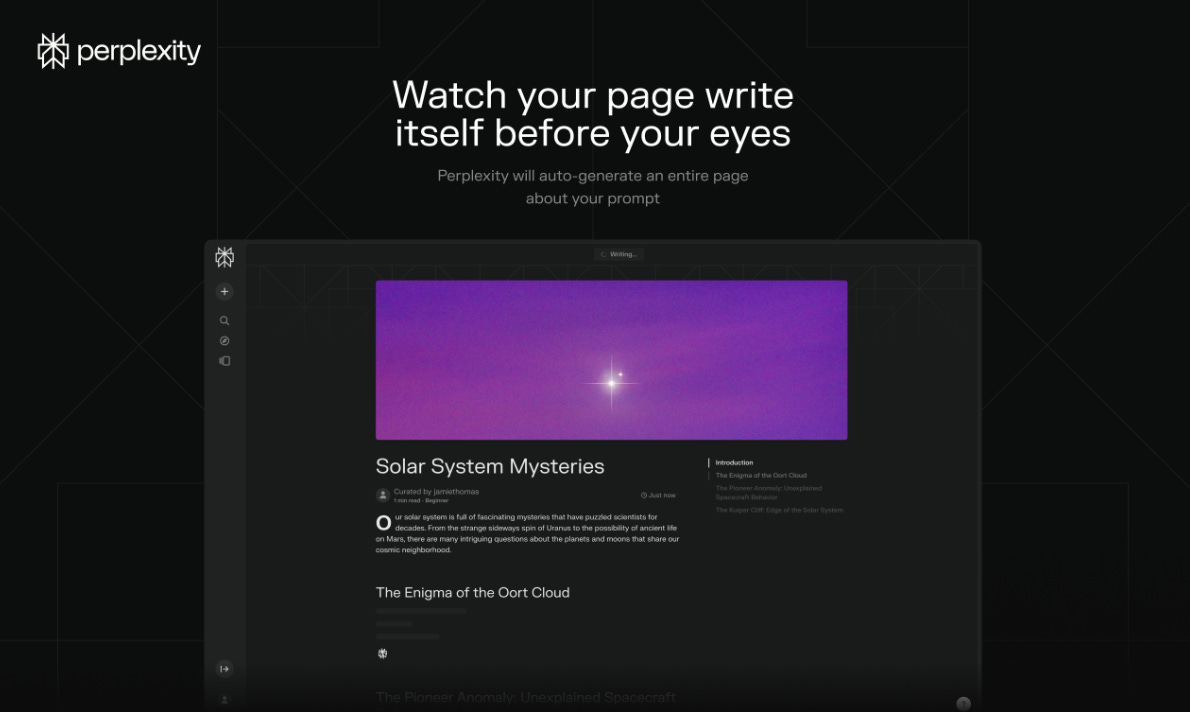Perplexity Pages transforms your research into visually stunning, comprehensive, and shareable content. Whether you're crafting in-depth articles, detailed reports, or informative guides, Pages streamlines the process so you can focus on what matters most: sharing your knowledge with the world. (via Perplexity)